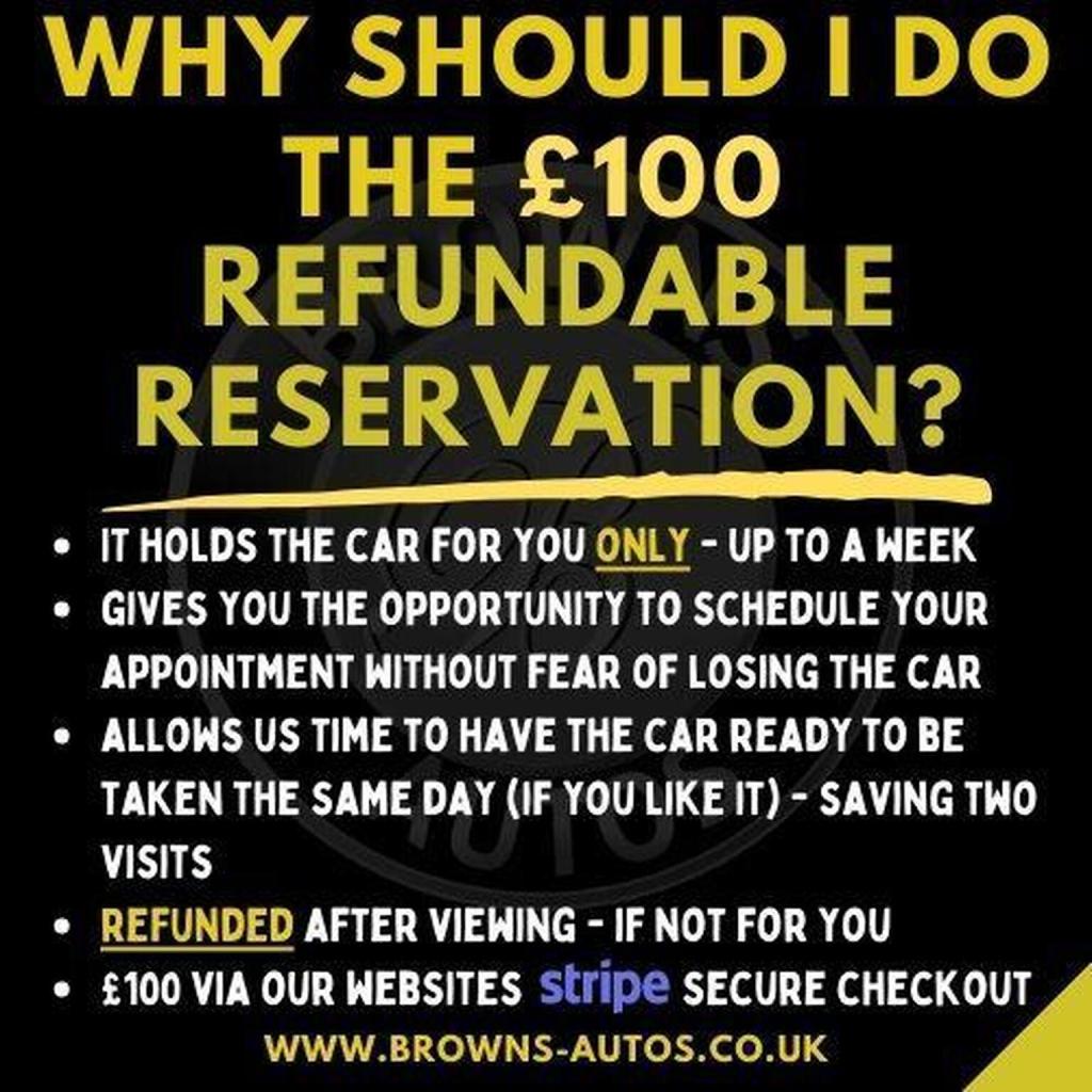 Reserve a car with us for a refundable fee of £100. This holds the car for you ONLY, until test drive and up to a week. This is fully refundable, but we ask that you DO arrive for your appointment, as we will be letting other customers know the car is reserved. This is a queuing system.